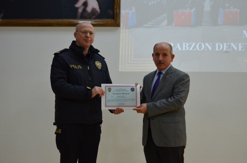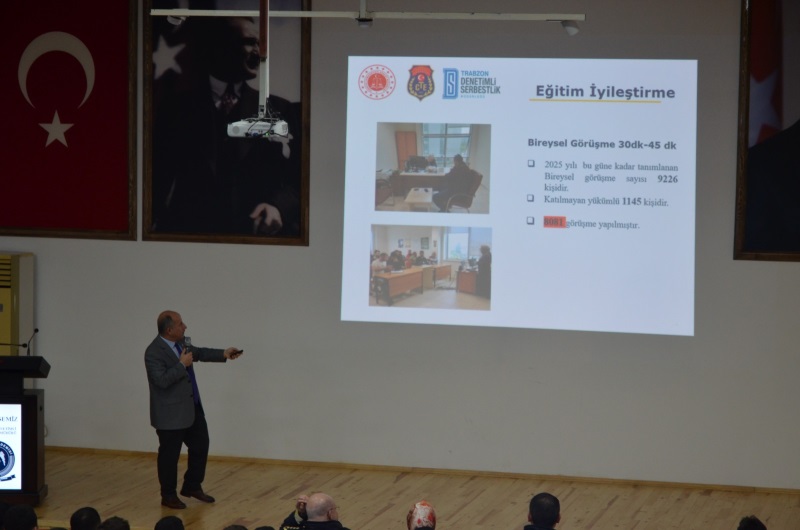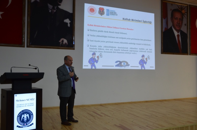 Denetimli Serbestlik Sisteminin tanıtımı, kolluk birimlerince uygulanışı, şüpheli, sanık veya hükümlünün toplum içinde denetim ve takibi hususlarında Trabzon Şehit Meriç Alemdar Polis Meslek Eğitim Merkezi öğrencilerine yönelik olarak Denetimli Serbestlik Müdürü Mehmet SEMİZ tarafından “Denetimli Serbestlik Sisteminin Hukuki ve Uygulamalı Boyutu” konulu konferans verilmiştir.